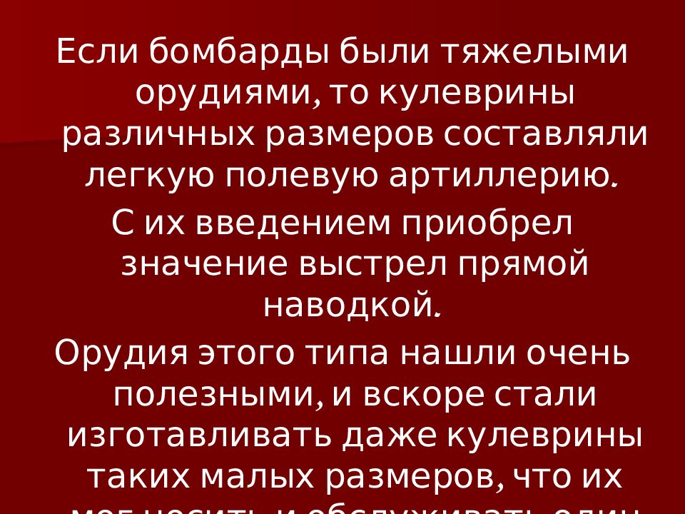 Если бомбарды были тяжелыми орудиями, то кулеврины различных размеров составляли легкую полевую артиллерию. С их введением приобрел значение выстрел прямой наводкой. Орудия этого типа нашли очень полезными, и вскоре стали изготавливать даже кулеврины таких малых размеров, что их мог носить и обслуживать один человек.