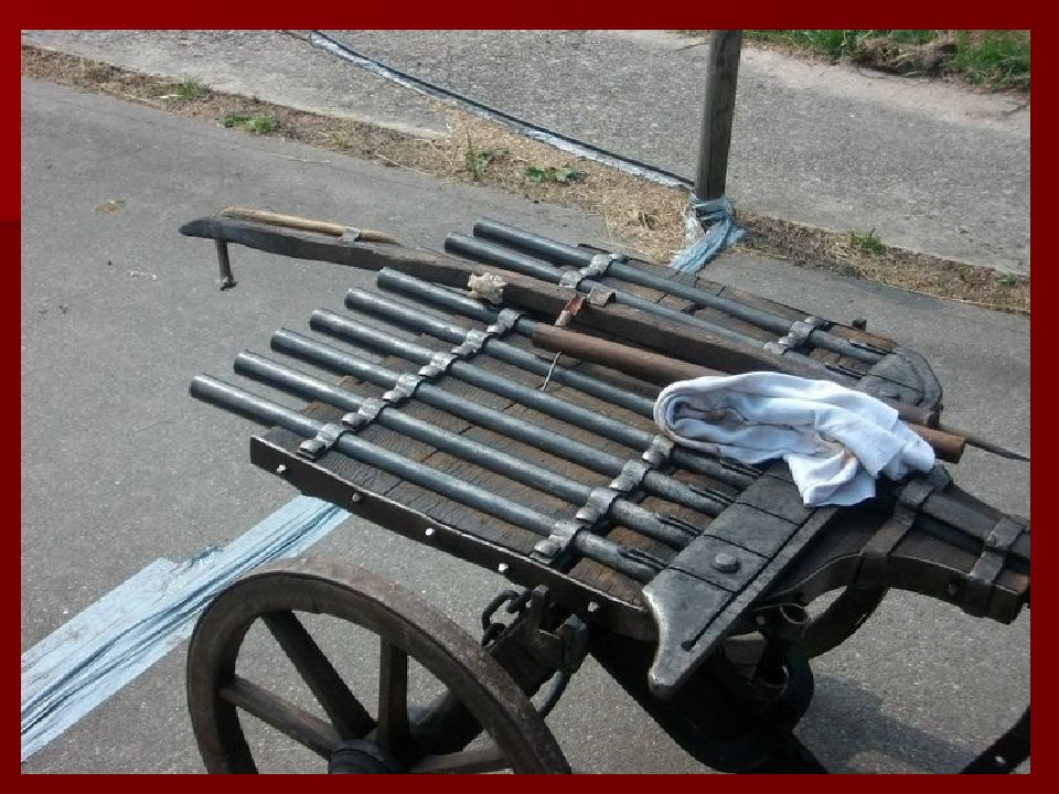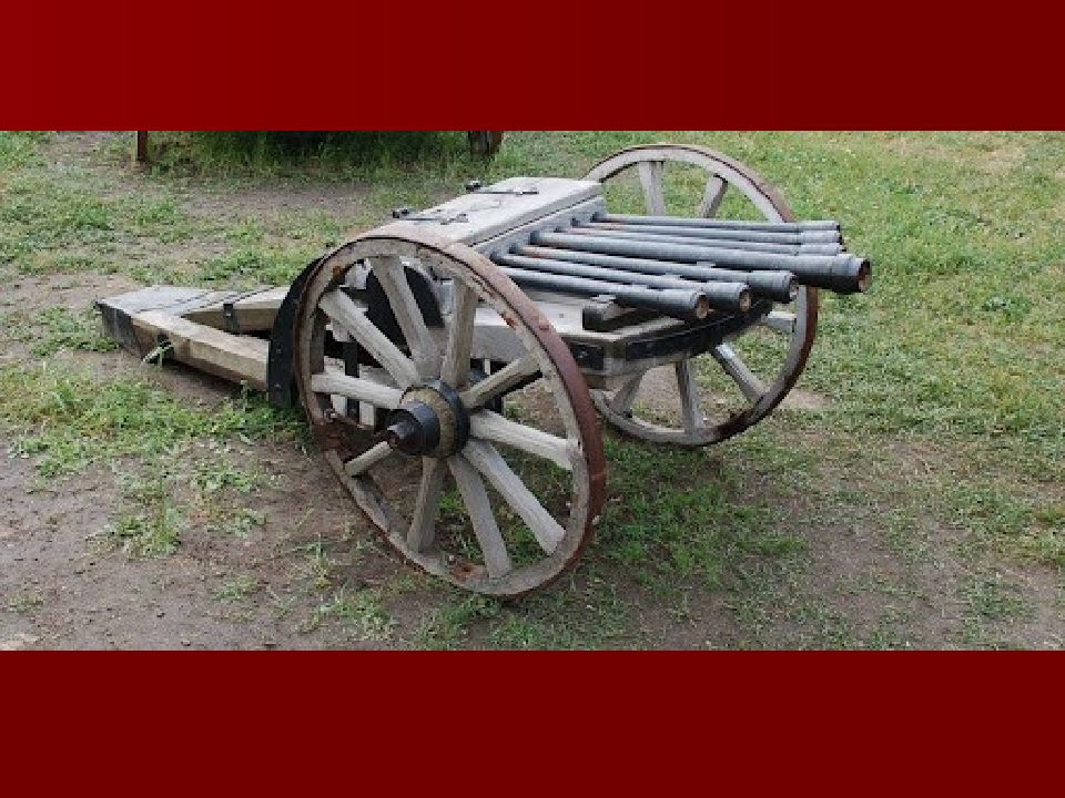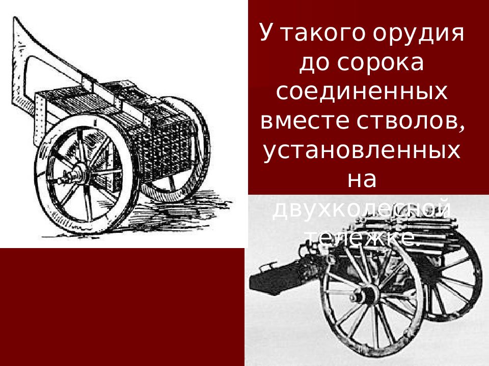 У такого орудия до сорока соединенных вместе стволов, установленных на двухколесной тележке.