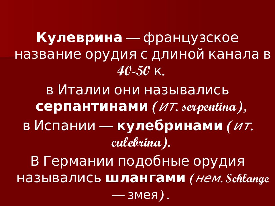 Кулеврина — французское название орудия с длиной канала в 40-50 к. в Италии они назывались серпантинами ( ит. serpentina), в Испании — кулебринами ( ит. culebrina). В Германии подобные орудия назывались шлангами ( нем. Schlange — змея). Русское название кулеврины — пищаль.