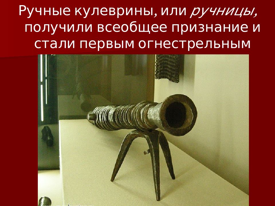 Ручные кулеврины, или ручницы, получили всеобщее признание и стали первым огнестрельным оружием пехоты.