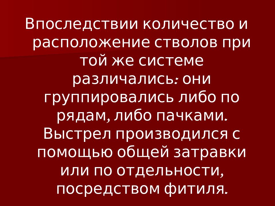 Впоследствии количество и расположение стволов при той же системе различались: они группировались либо по рядам, либо пачками. Выстрел производился с помощью общей затравки или по отдельности, посредством фитиля.