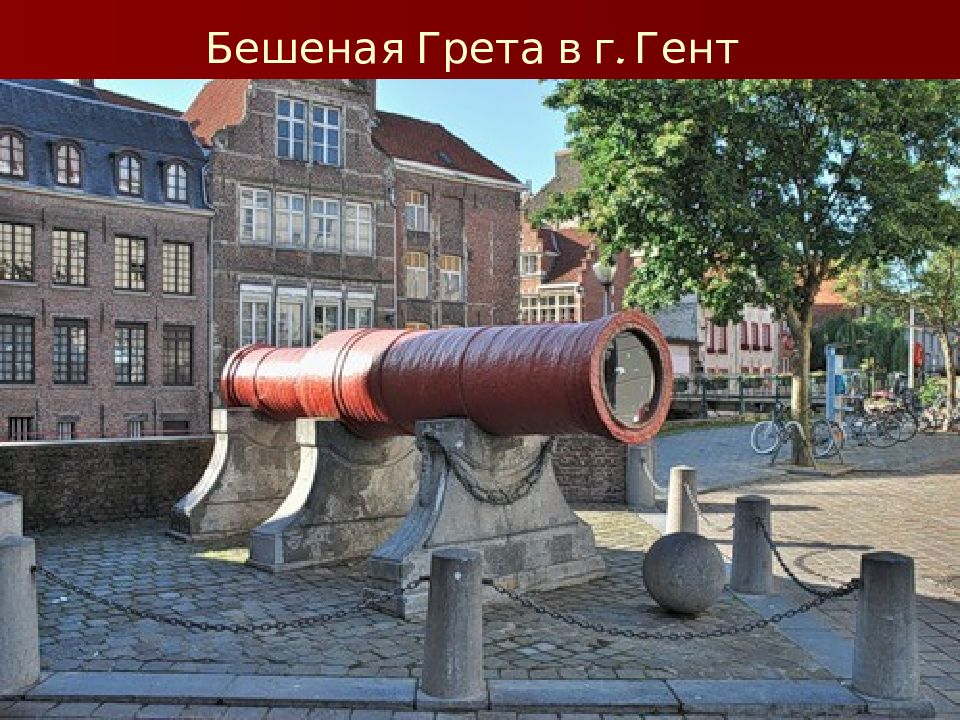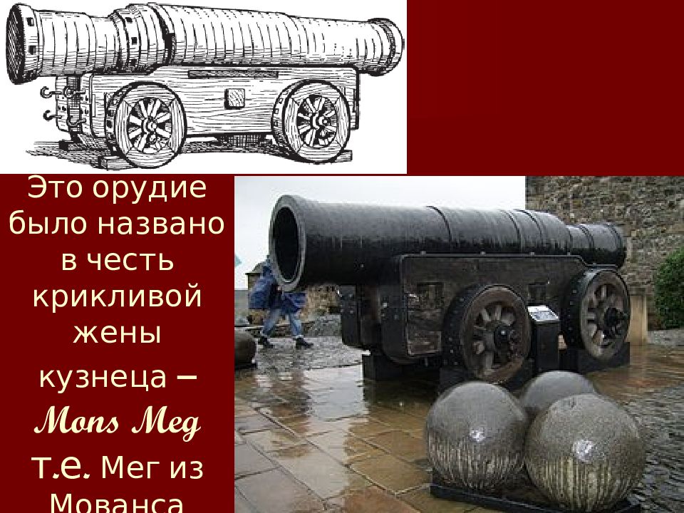 Слайд 13: Это орудие было названо в честь крикливой жены кузнеца – Mons Meg т.е. Мег из Мованса