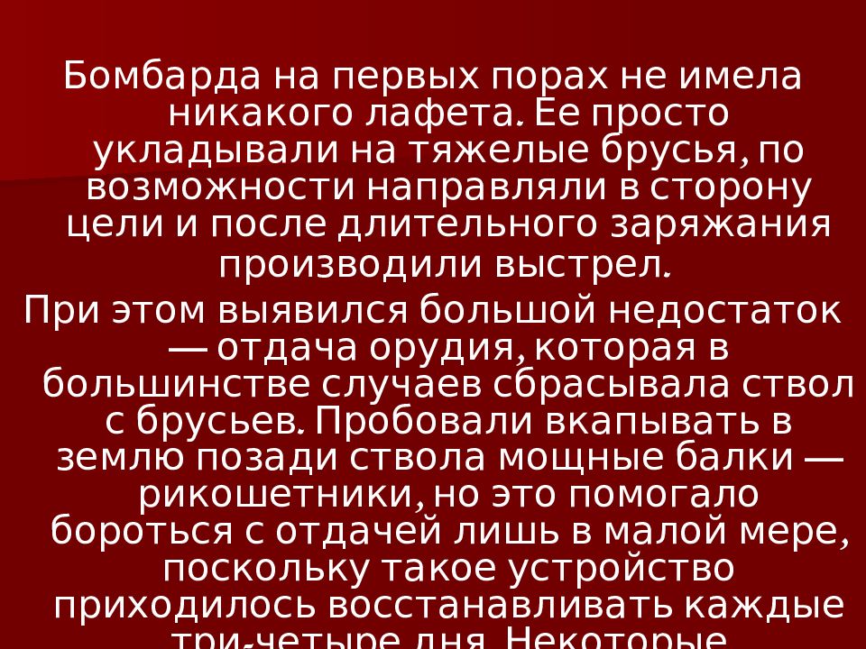 Бомбарда на первых порах не имела никакого лафета. Ее просто укладывали на тяжелые брусья, по возможности направляли в сторону цели и после длительного заряжания производили выстрел. При этом выявился большой недостаток — отдача орудия, которая в большинстве случаев сбрасывала ствол с брусьев. Пробовали вкапывать в землю позади ствола мощные балки — рикошетники, но это помогало бороться с отдачей лишь в малой мере, поскольку такое устройство приходилось восстанавливать каждые три-четыре дня. Некоторые оружейники стремились «утопить» ствол как можно глубже в землю.