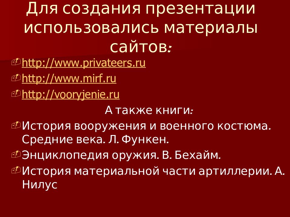 http://www.privateers.ru http://www.mirf.ru http://vooryjenie.ru А также книги: История вооружения и военного костюма. Средние века. Л. Функен. Энциклопедия оружия. В. Бехайм. История материальной части артиллерии. А. Нилус