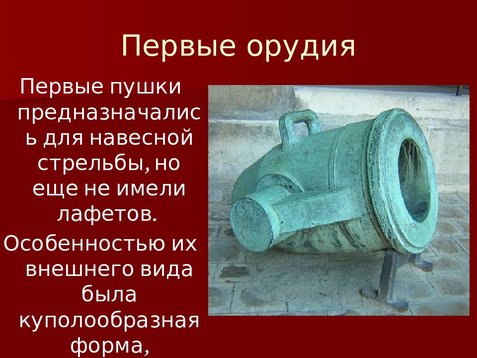Первые пушки предназначались для навесной стрельбы, но еще не имели лафетов. Особенностью их внешнего вида была куполообразная форма, напоминающая котелок.