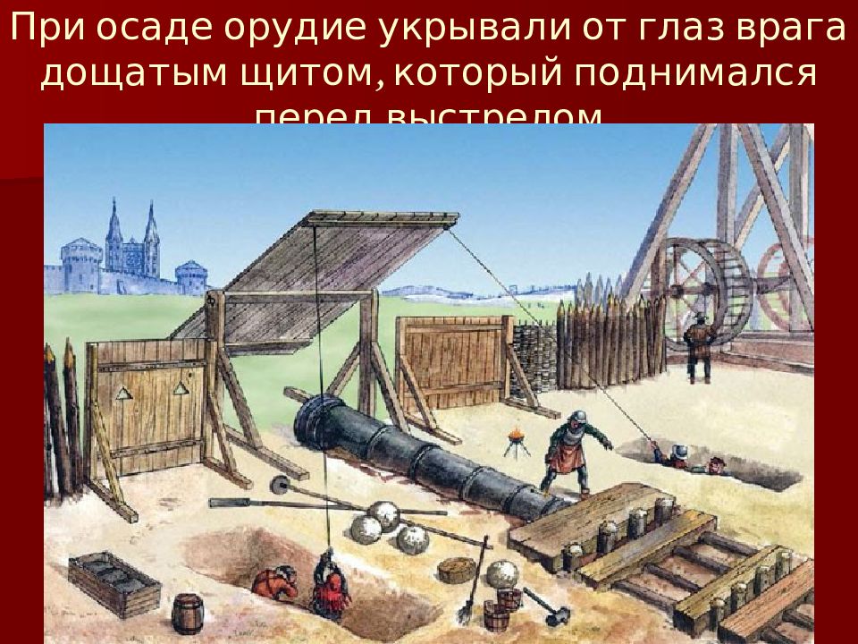 Слайд 7: При осаде орудие укрывали от глаз врага дощатым щитом, который поднимался перед выстрелом