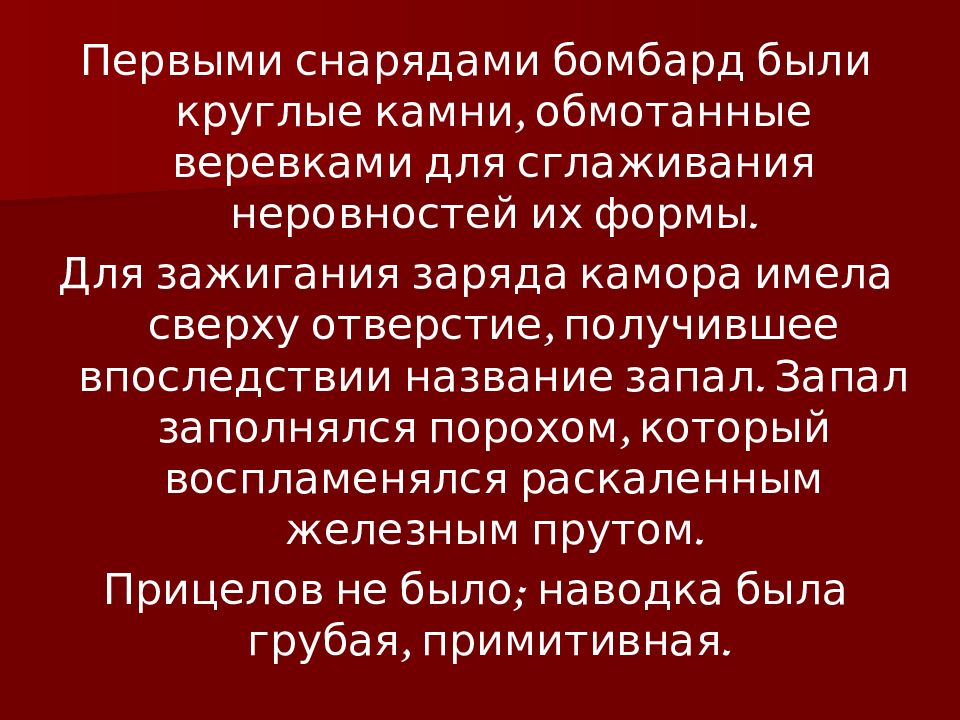 Первыми снарядами бомбард были круглые камни, обмотанные веревками для сглаживания неровностей их формы. Для зажигания заряда камора имела сверху отверстие, получившее впоследствии название запал. Запал заполнялся порохом, который воспламенялся раскаленным железным прутом. Прицелов не было; наводка была грубая, примитивная.