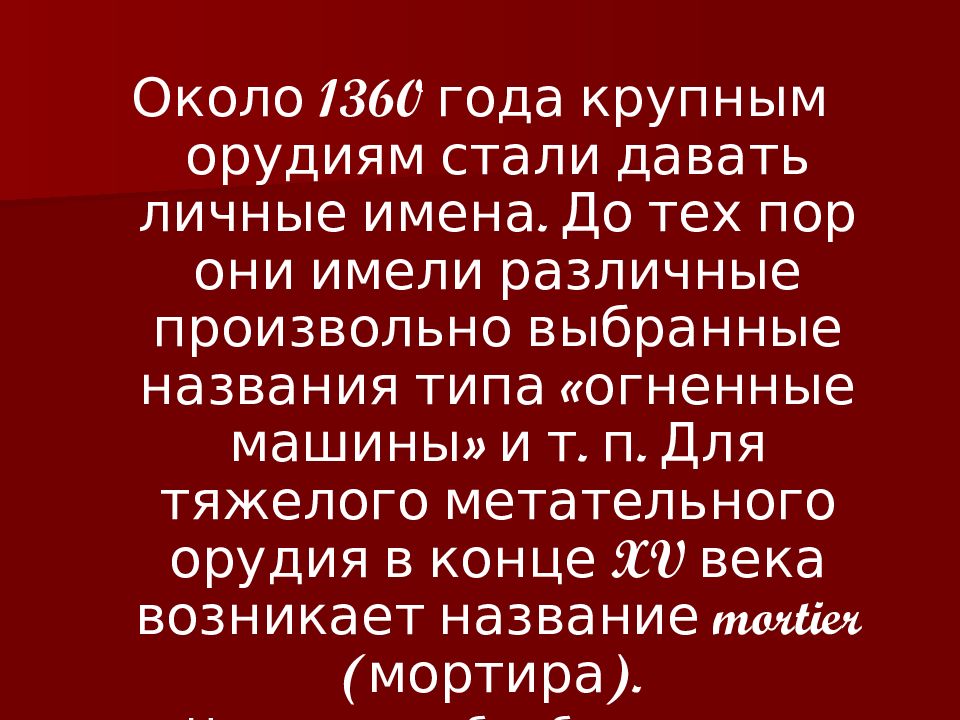 Около 1360 года крупным орудиям стали давать личные имена. До тех пор они имели различные произвольно выбранные названия типа «огненные машины» и т. п. Для тяжелого метательного орудия в конце XV века возникает название mortier (мортира). Недостатки бомбард – это отсутствие лафета и частые разрывы.