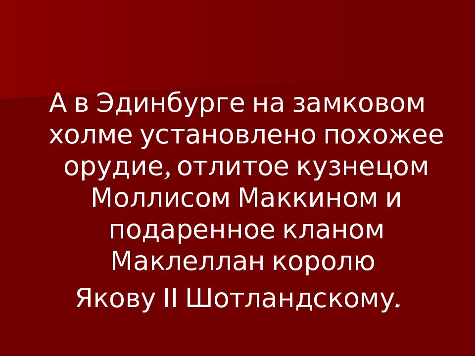 А в Эдинбурге на замковом холме установлено похожее орудие, отлитое кузнецом Моллисом Маккином и подаренное кланом Маклеллан королю Якову II Шотландскому.