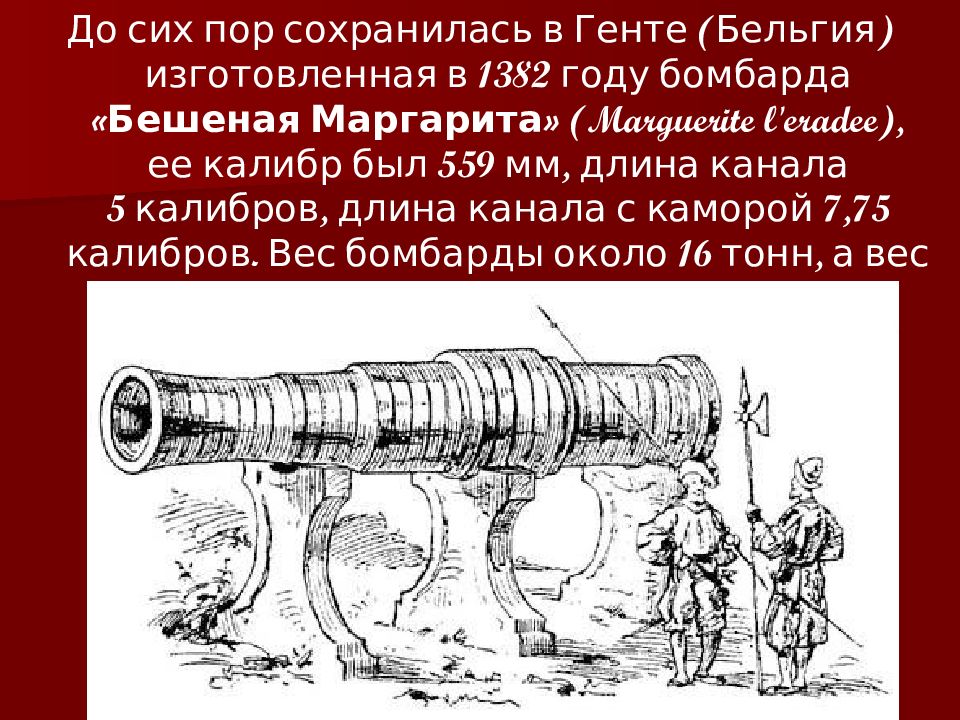 До сих пор сохранилась в Генте (Бельгия) изготовленная в 1382 году бомбарда «Бешеная Маргарита» (Marguerite l'eradee), ее калибр был 559 мм, длина канала 5 калибров, длина канала с каморой 7,75 калибров. Вес бомбарды около 16 тонн, а вес ее каменного ядра около 320 кг.