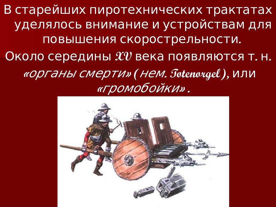 В старейших пиротехнических трактатах уделялось внимание и устройствам для повышения скорострельности. Около середины XV века появляются т. н. «органы смерти» ( нем. Totenorgel), или «громобойки».