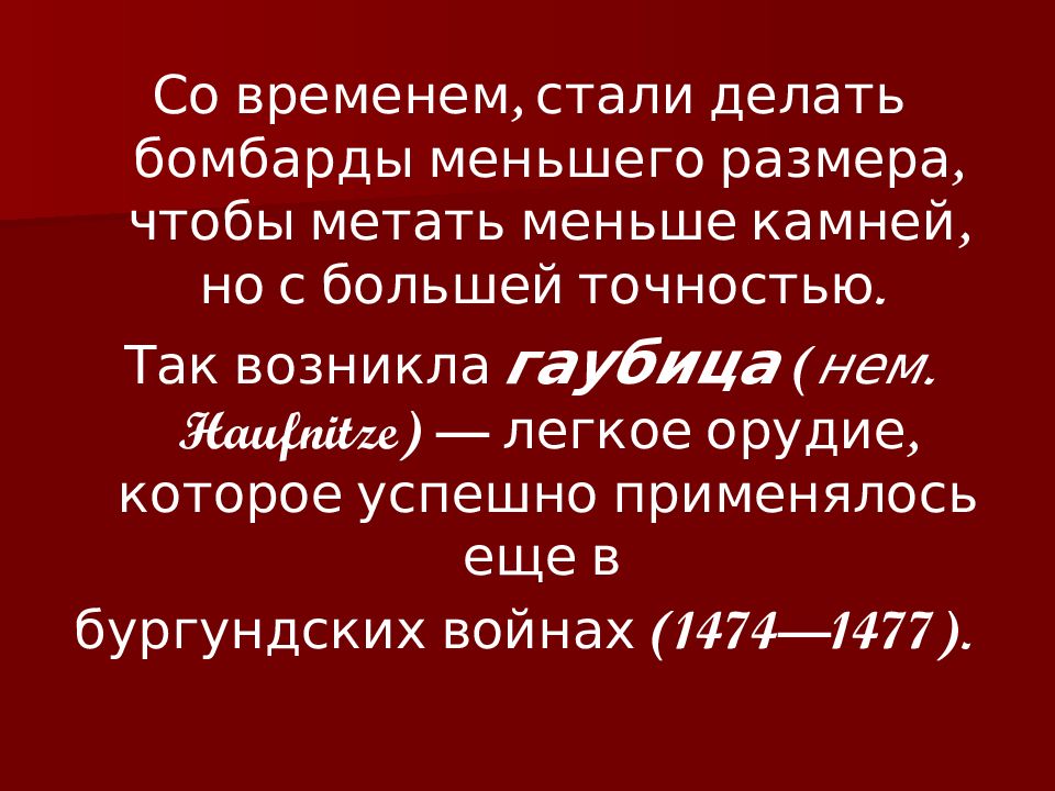 Со временем, стали делать бомбарды меньшего размера, чтобы метать меньше камней, но с большей точностью. Так возникла гаубица ( нем. Haufnitze) — легкое орудие, которое успешно применялось еще в бургундских войнах (1474—1477).