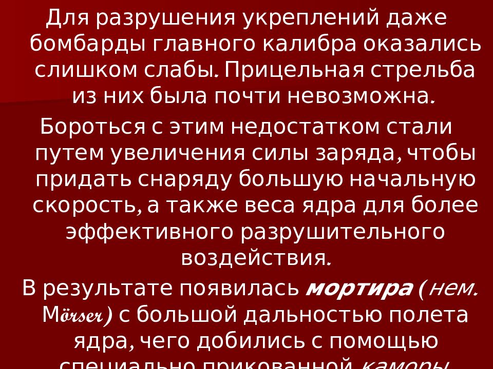 Для разрушения укреплений даже бомбарды главного калибра оказались слишком слабы. Прицельная стрельба из них была почти невозможна. Бороться с этим недостатком стали путем увеличения силы заряда, чтобы придать снаряду большую начальную скорость, а также веса ядра для более эффективного разрушительного воздействия. В результате появилась мортира ( нем. Мörser) с большой дальностью полета ядра, чего добились с помощью специально прикованной каморы ( нем. Kammer).
