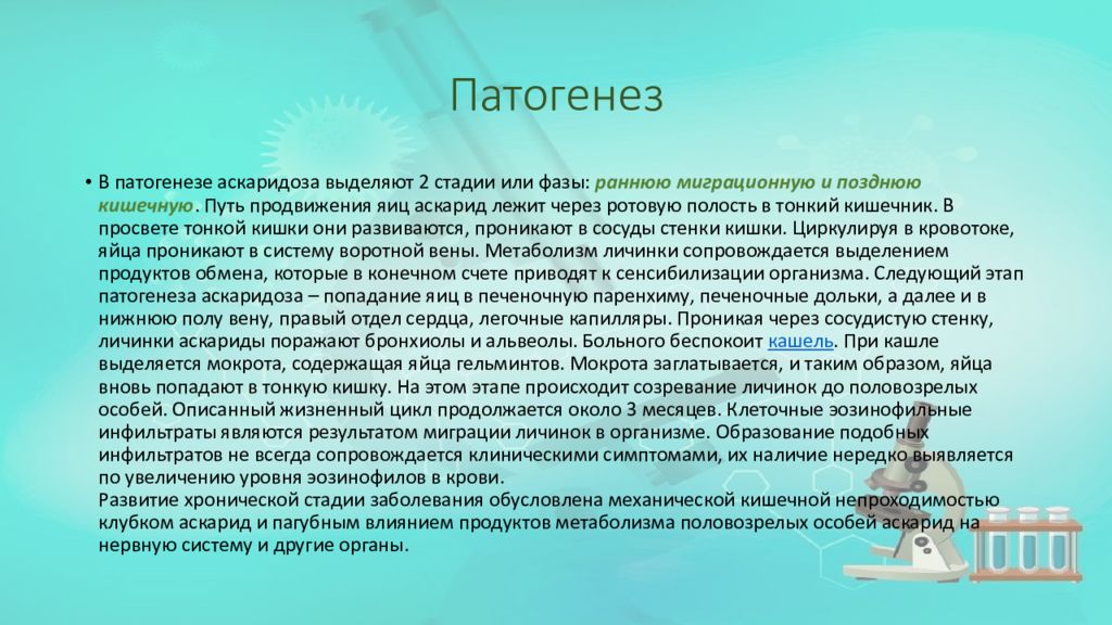 В патогенезе аскаридоза выделяют 2 стадии или фазы: раннюю миграционную и позднюю кишечную. Путь продвижения яиц аскарид лежит через ротовую полость в тонкий кишечник. В просвете тонкой кишки они развиваются, проникают в сосуды стенки кишки. Циркулируя в кровотоке, яйца проникают в систему воротной вены. Метаболизм личинки сопровождается выделением продуктов обмена, которые в конечном счете приводят к сенсибилизации организма. Следующий этап патогенеза аскаридоза – попадание яиц в печеночную паренхиму, печеночные дольки, а далее и в нижнюю полу вену, правый отдел сердца, легочные капилляры. Проникая через сосудистую стенку, личинки аскариды поражают бронхиолы и альвеолы. Больного беспокоит кашель. При кашле выделяется мокрота, содержащая яйца гельминтов. Мокрота заглатывается, и таким образом, яйца вновь попадают в тонкую кишку. На этом этапе происходит созревание личинок до половозрелых особей. Описанный жизненный цикл продолжается около 3 месяцев. Клеточные эозинофильные инфильтраты являются результатом миграции личинок в организме. Образование подобных инфильтратов не всегда сопровождается клиническими симптомами, их наличие нередко выявляется по увеличению уровня эозинофилов в крови. Развитие хронической стадии заболевания обусловлена механической кишечной непроходимостью клубком аскарид и пагубным влиянием продуктов метаболизма половозрелых особей аскарид на нервную систему и другие органы.