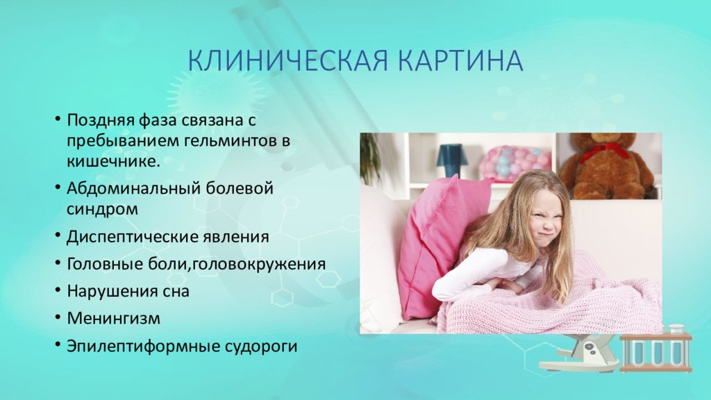 Поздняя фаза связана с пребыванием гельминтов в кишечнике. Абдоминальный болевой синдром Диспептические явления Головные боли,головокружения Нарушения сна Менингизм Эпилептиформные судороги