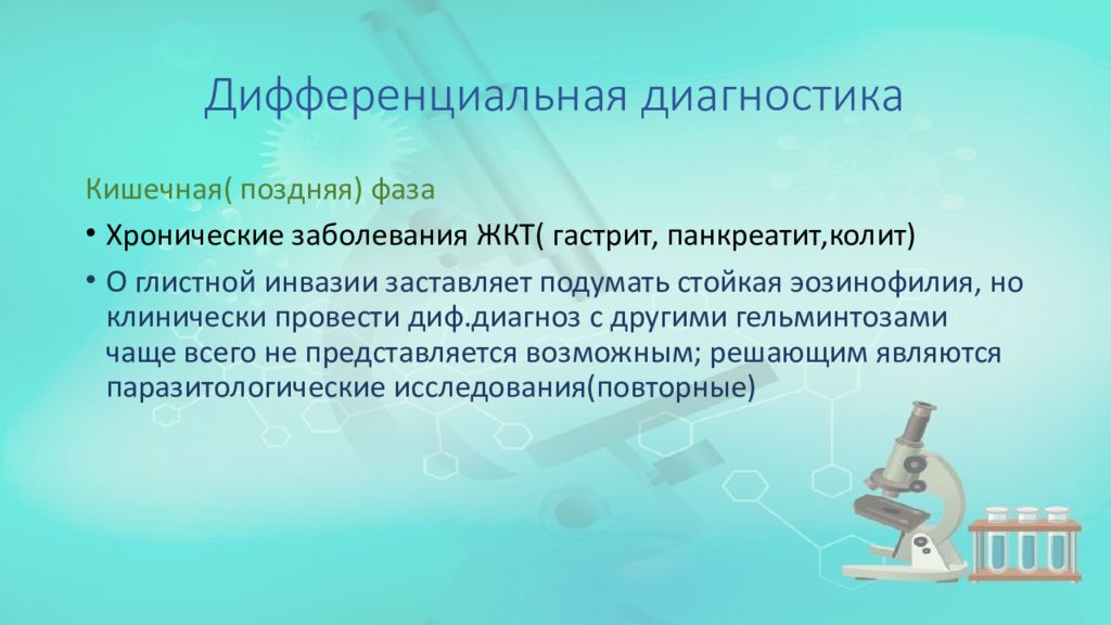 Кишечная( поздняя) фаза Хронические заболевания ЖКТ( гастрит, панкреатит,колит ) О глистной инвазии заставляет подумать стойкая эозинофилия, но клинически провести диф.диагноз с другими гельминтозами чаще всего не представляется возможным; решающим являются паразитологические исследования(повторные)