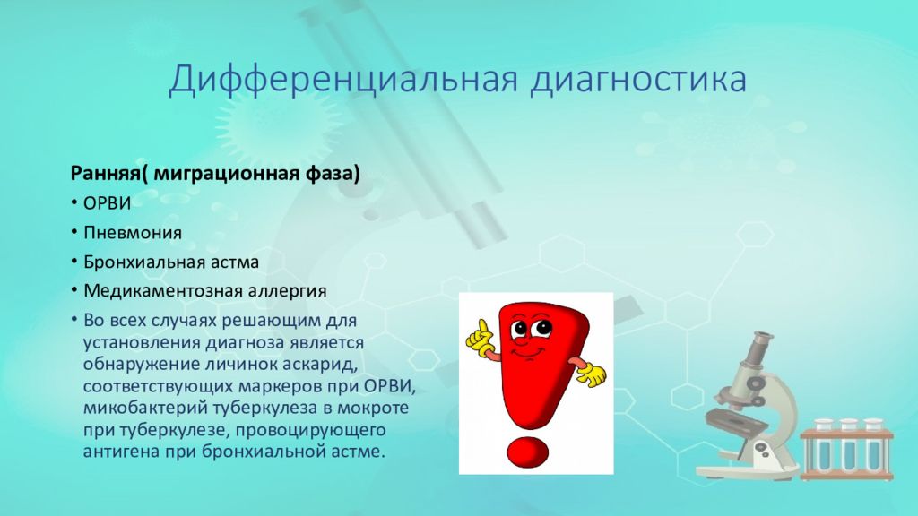Ранняя( миграционная фаза) ОРВИ Пневмония Бронхиальная астма Медикаментозная аллергия Во всех случаях решающим для установления диагноза является обнаружение личинок аскарид, соответствующих маркеров при ОРВИ, микобактерий туберкулеза в мокроте при туберкулезе, провоцирующего антигена при бронхиальной астме.