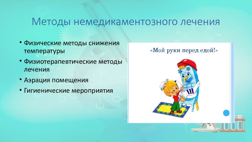 Физические методы снижения температуры Физиотерапевтические методы лечения Аэрация помещения Гигиенические мероприятия