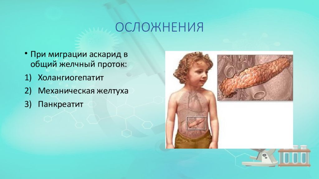 При миграции аскарид в общий желчный проток: Холангиогепатит Механическая желтуха Панкреатит