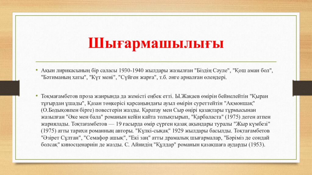 Ақын лирикасының бір саласы 1930-1940 жылдары жазылған " Біздің Сәуле ", " Қош аман бол", " Бәтиманың хаты", " Күт мені ", " Сүйген жарға ", т.б. әнге арналған өлеңдері. Тоқмағамбетов проза жанрында да жемісті еңбек етті. Ы.Жақаев өмірін бейнелейтін " Қыран тұғырдан ұшады ", Қазан төңкерісі қарсаңындағы ауыл өмірін суреттейтін " Ақмоншақ " ( О.Бодықовпен бірге ) повестерін жазды. Қаратау мен Сыр өңірі қазақтары тұрмысынан жазылған " Әке мен бала" романын кейін кайта толықтырып, " Қарбаласта " (1975) деген атпен жариялады. Тоқтағамбетов — 19 ғасырда өмір сүрген қазақ ақындары туралы " Жыр күмбезі " (1975) атты тарихи романның авторы. " Күлкі-сықақ " 1929 жылдары басылды. Тоқтағамбетов " Әзірет Сұлтан ", "Семафор ашық ", " Екі заң " атты драмалық шығармалар, " Бәріміз де сондай болсақ " киносценариін де жазды. С. Айнидің " Құлдар " романын қазақшаға аударды (1953).