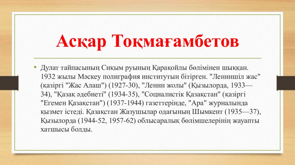 Дулат тайпасының Сиқым руының Қарақойлы бөлімінен шыққан. 1932 жылы Мәскеу полиграфия институтын бітірген. " Лениншіл жас " ( қазіргі " Жас Алаш ") (1927-30), "Ленин жолы " ( Қызылорда, 1933—34), " Қазақ әдебиеті " (1934-35), " Социалистік Қазақстан " ( қазіргі " Егемен Қазақстан ") (1937-1944) газеттерінде, "Ара" журналында қызмет істеді. Қазақстан Жазушылар одағының Шымкент (1935—37), Қызылорда (1944-52, 1957-62) облысаралық бөлімшелерінің жауапты хатшысы болды.