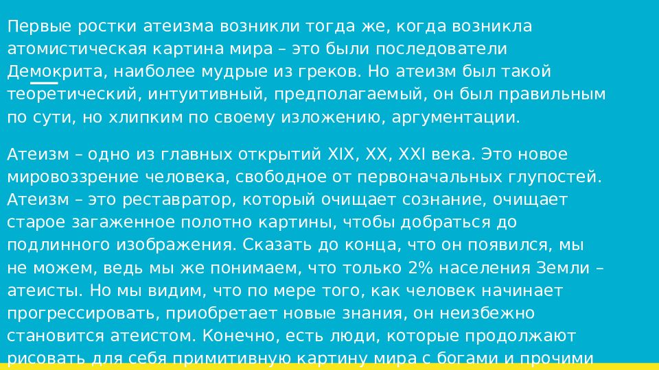 Первые ростки атеизма возникли тогда же, когда возникла атомистическая картина мира – это были последователи Демокрита, наиболее мудрые из греков. Но атеизм был такой теоретический, интуитивный, предполагаемый, он был правильным по сути, но хлипким по своему изложению, аргументации. Атеизм – одно из главных открытий XIX, XX, XXI века. Это новое мировоззрение человека, свободное от первоначальных глупостей. Атеизм – это реставратор, который очищает сознание, очищает старое загаженное полотно картины, чтобы добраться до подлинного изображения. Сказать до конца, что он появился, мы не можем, ведь мы же понимаем, что только 2% населения Земли – атеисты. Но мы видим, что по мере того, как человек начинает прогрессировать, приобретает новые знания, он неизбежно становится атеистом. Конечно, есть люди, которые продолжают рисовать для себя примитивную картину мира с богами и прочими глупостями. Атеизм – прежде всего, признак высокого интеллекта.