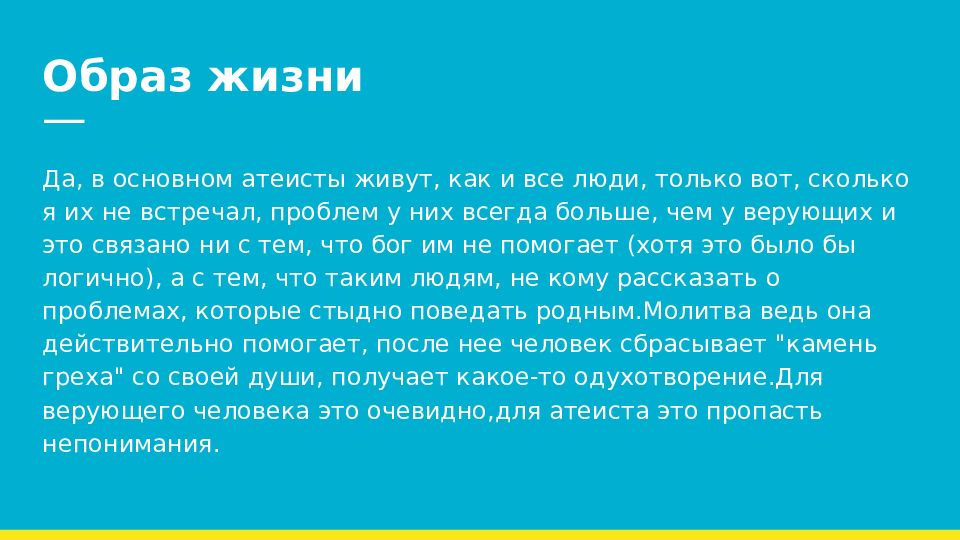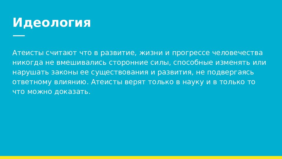 Атеисты считают что в развитие, жизни и прогрессе человечества никогда не вмешивались сторонние силы, способные изменять или нарушать законы ее существования и развития, не подвергаясь ответному влиянию. Атеисты верят только в науку и в только то что можно доказать.