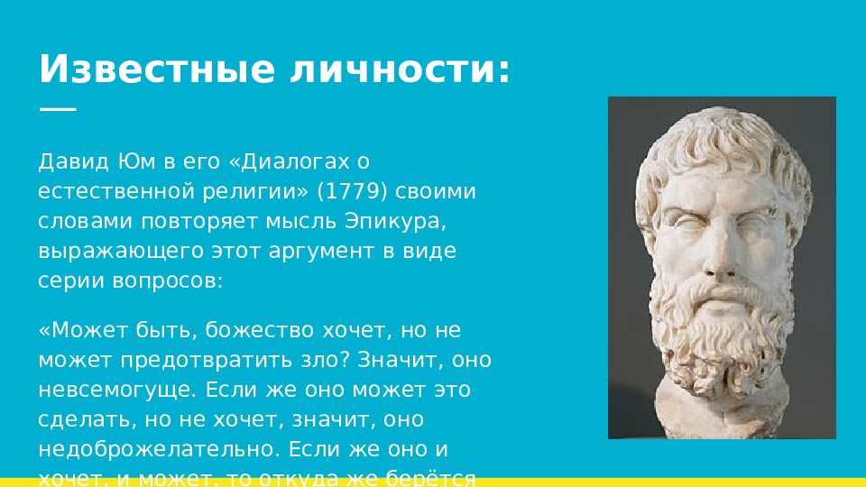 Давид Юм в его «Диалогах о естественной религии» (1779) своими словами повторяет мысль Эпикура, выражающего этот аргумент в виде серии вопросов: «Может быть, божество хочет, но не может предотвратить зло? Значит, оно невсемогуще. Если же оно может это сделать, но не хочет, значит, оно недоброжелательно. Если же оно и хочет, и может, то откуда же берётся зло?