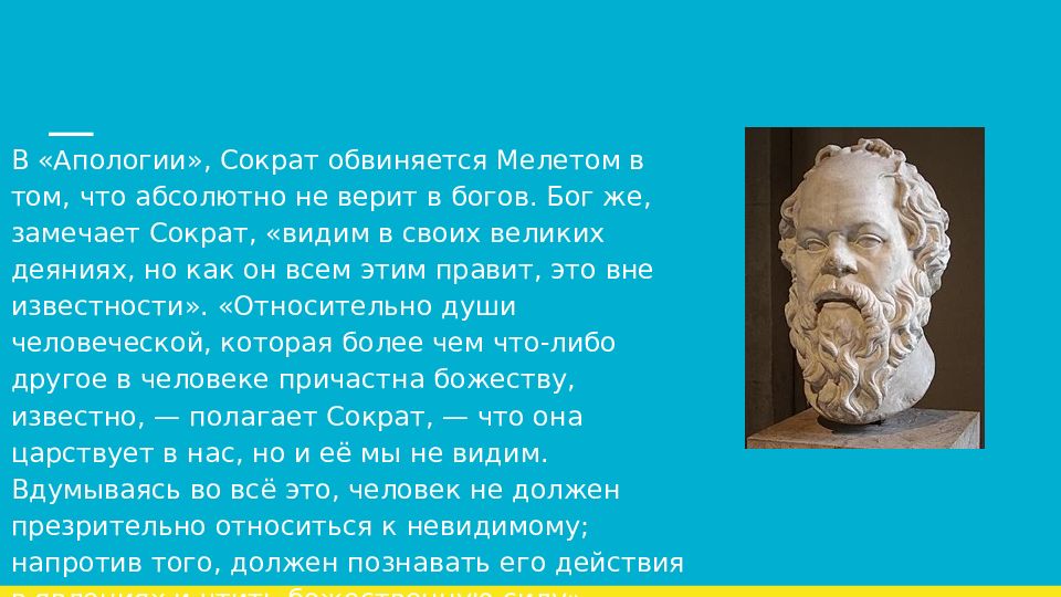 В «Апологии», Сократ обвиняется Мелетом в том, что абсолютно не верит в богов. Бог же, замечает Сократ, «видим в своих великих деяниях, но как он всем этим правит, это вне известности». «Относительно души человеческой, которая более чем что-либо другое в человеке причастна божеству, известно, — полагает Сократ, — что она царствует в нас, но и её мы не видим. Вдумываясь во всё это, человек не должен презрительно относиться к невидимому; напротив того, должен познавать его действия в явлениях и чтить божественную силу»