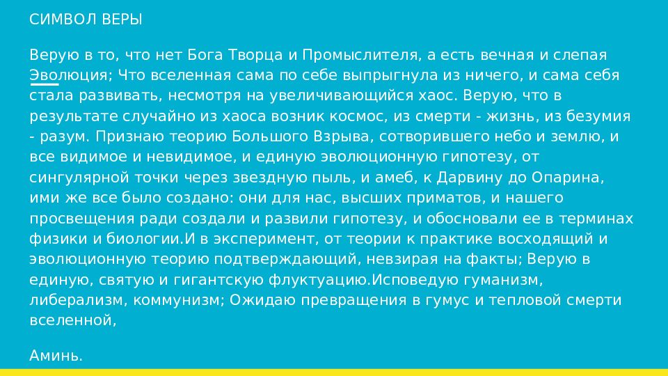 СИМВОЛ ВЕРЫ Верую в то, что нет Бога Творца и Промыслителя, а есть вечная и слепая Эволюция; Что вселенная сама по себе выпрыгнула из ничего, и сама себя стала развивать, несмотря на увеличивающийся хаос. Верую, что в результате случайно из хаоса возник космос, из смерти - жизнь, из безумия - разум. Признаю теорию Большого Взрыва, сотворившего небо и землю, и все видимое и невидимое, и единую эволюционную гипотезу, от сингулярной точки через звездную пыль, и амеб, к Дарвину до Опарина, ими же все было создано: они для нас, высших приматов, и нашего просвещения ради создали и развили гипотезу, и обосновали ее в терминах физики и биологии.И в эксперимент, от теории к практике восходящий и эволюционную теорию подтверждающий, невзирая на факты; Верую в единую, святую и гигантскую флуктуацию.Исповедую гуманизм, либерализм, коммунизм; Ожидаю превращения в гумус и тепловой смерти вселенной, Аминь.
