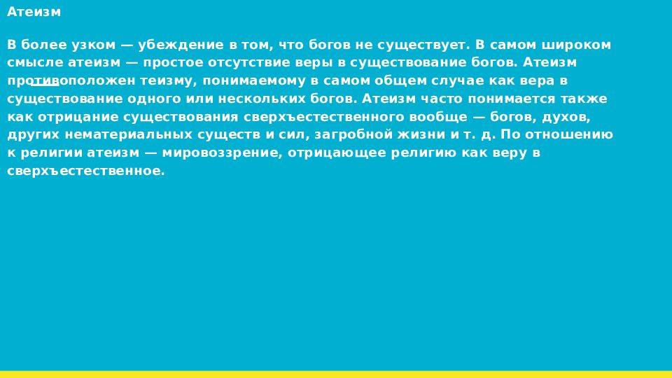 Атеизм В более узком — убеждение в том, что богов не существует. В самом широком смысле атеизм — простое отсутствие веры в существование богов. Атеизм противоположен теизму, понимаемому в самом общем случае как вера в существование одного или нескольких богов. Атеизм часто понимается также как отрицание существования сверхъестественного вообще — богов, духов, других нематериальных существ и сил, загробной жизни и т. д. По отношению к религии атеизм — мировоззрение, отрицающее религию как веру в сверхъестественное.