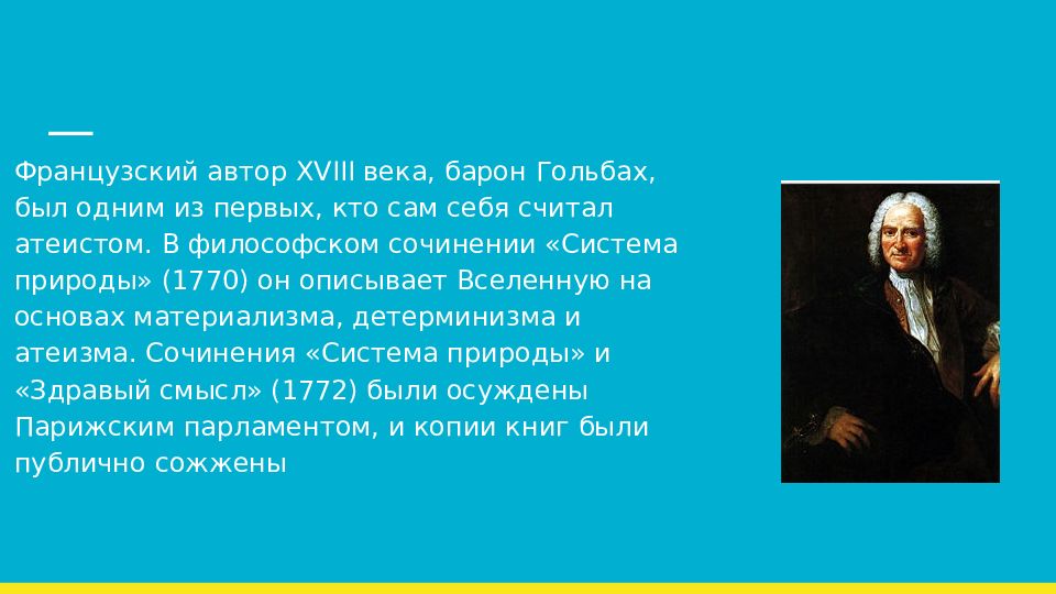 Французский автор XVIII века, барон Гольбах, был одним из первых, кто сам себя считал атеистом. В философском сочинении «Система природы» (1770) он описывает Вселенную на основах материализма, детерминизма и атеизма. Сочинения «Система природы» и «Здравый смысл» (1772) были осуждены Парижским парламентом, и копии книг были публично сожжены