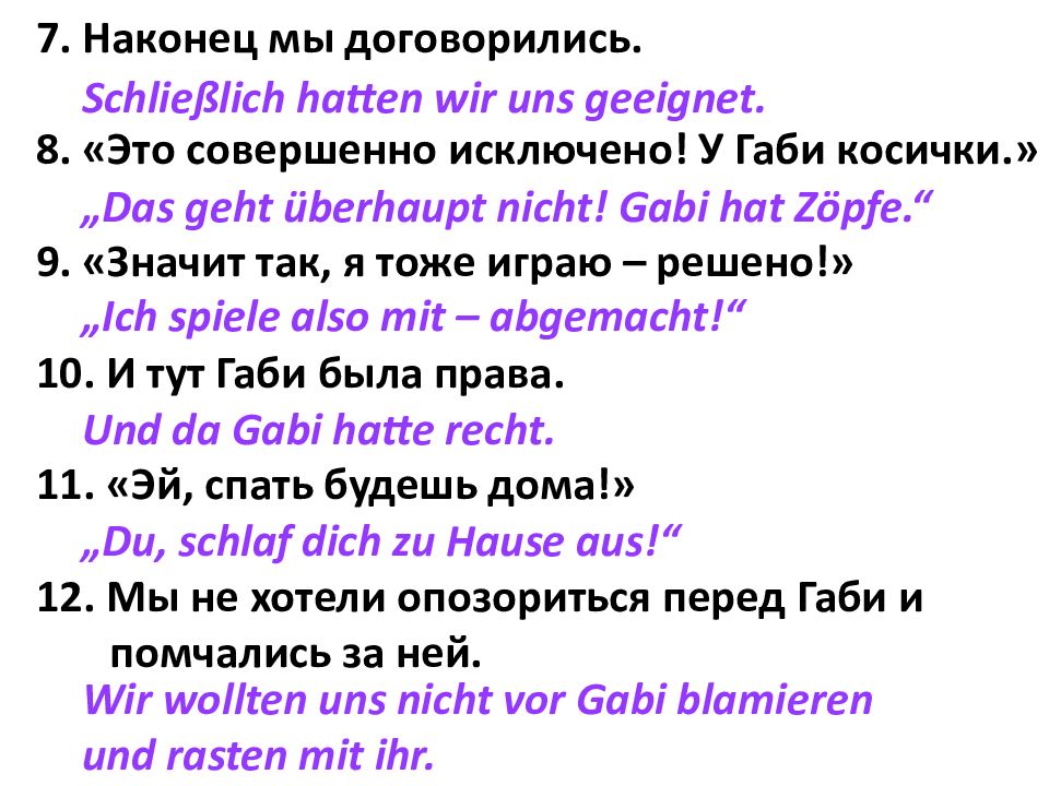 7. Наконец мы договорились. 8. «Это совершенно исключено! У Габи косички.» 9. «Значит так, я тоже играю – решено!» 10. И тут Габи была права. 11. «Эй, спать будешь дома!» 12. Мы не хотели опозориться перед Габи и помчались за ней. Schließlich hatten wir uns geeignet. „Das geht überhaupt nicht! Gabi hat Zöpfe.“ „Ich spiele also mit – abgemacht!“ Und da Gabi hatte recht. „Du, schlaf dich zu Hause aus!“ Wir wollten uns nicht vor Gabi blamieren und rasten mit ihr.