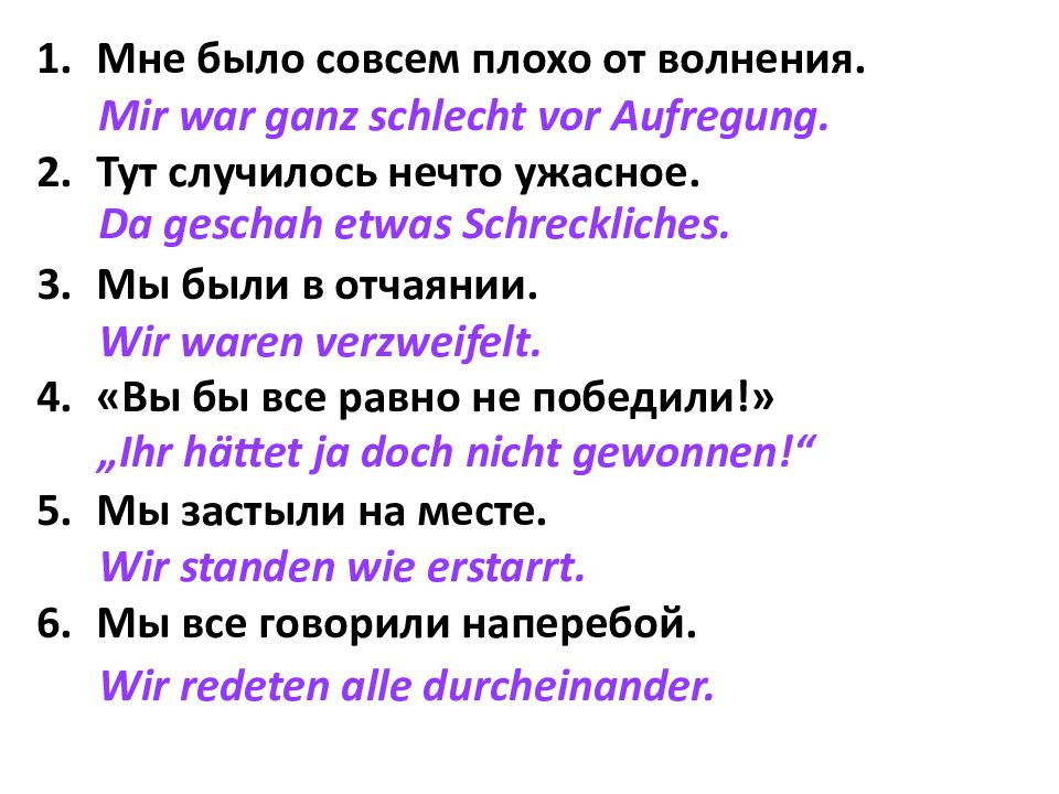 Мне было совсем плохо от волнения. Тут случилось нечто ужасное. Мы были в отчаянии. «Вы бы все равно не победили!» Мы застыли на месте. Мы все говорили наперебой. Mir war ganz schlecht vor Aufregung. Da geschah etwas Schreckliches. Wir waren verzweifelt. „Ihr hättet ja doch nicht gewonnen!“ Wir standen wie erstarrt. Wir redeten alle durcheinander.