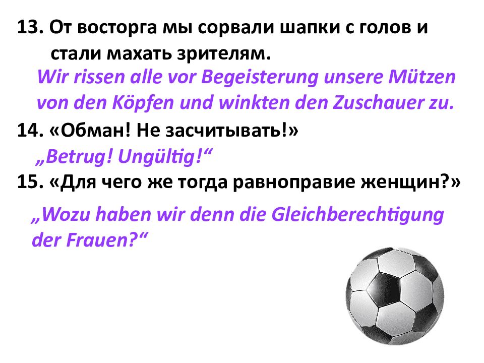 13. От восторга мы сорвали шапки с голов и стали махать зрителям. 14. «Обман! Не засчитывать!» 15. «Для чего же тогда равноправие женщин?» Wir rissen alle vor Begeisterung unsere Mützen von den Köpfen und winkten den Zuschauer zu. „Betrug! Ungültig!“ „Wozu haben wir denn die Gleichberechtigung der Frauen?“