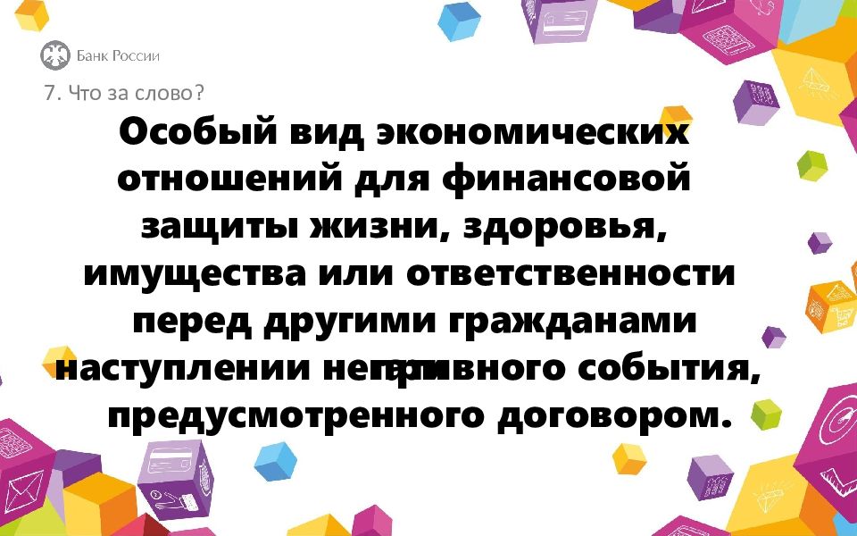 Особый вид экономических отношений для финансовой защиты жизни, здоровья, имущества или ответственности перед другими гражданами при наступлении негативного события, предусмотренного договором. 7. Что за слово?
