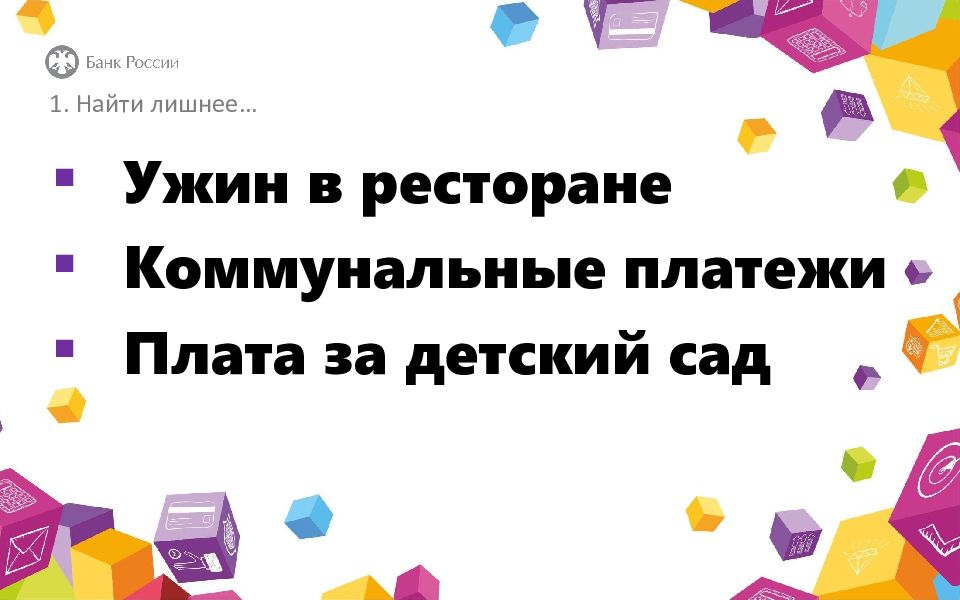 1. Найти лишнее… Ужин в ресторане Коммунальные платежи Плата за детский сад