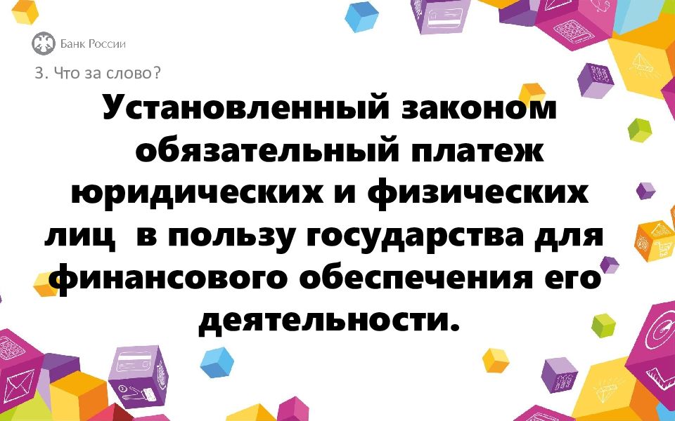 юридических и физических лиц в пользу государства для финансового обеспечения его деятельности. 3. Что за слово? Установленный законом обязательный платеж