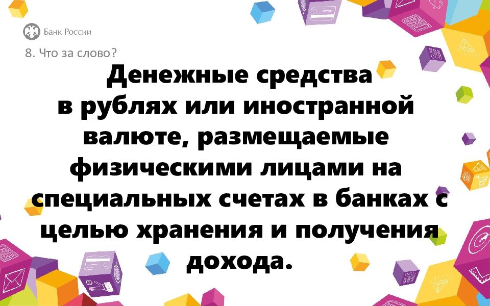 в рублях или иностранной валюте, размещаемые физическими лицами на специальных счетах в банках с целью хранения и получения дохода. 8. Что за слово?