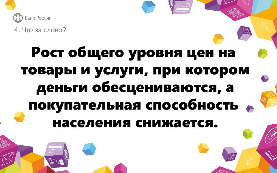 Рост общего уровня цен на товары и услуги, при котором деньги обесцениваются, а покупательная способность населения снижается. 4. Что за слово?