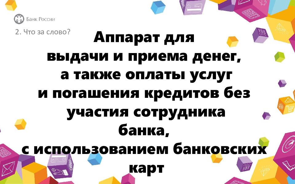 выдачи и приема денег, а также оплаты услуг и погашения кредитов без участия сотрудника банка, с использованием банковских карт 2. Что за слово?