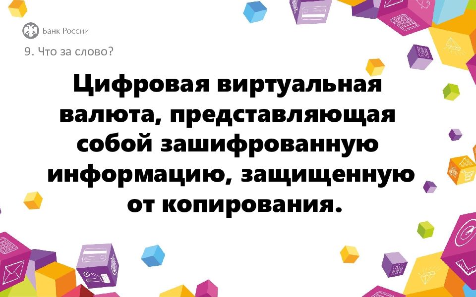 Цифровая виртуальная валюта, представляющая собой зашифрованную информацию, защищенную от копирования. 9. Что за слово?