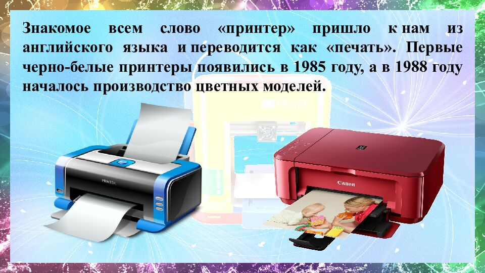 Знакомое всем слово «принтер» пришло к нам из английского языка и переводится как «печать». Первые черно-белые принтеры появились в 1985 году, а в 1988 году началось производство цветных моделей.