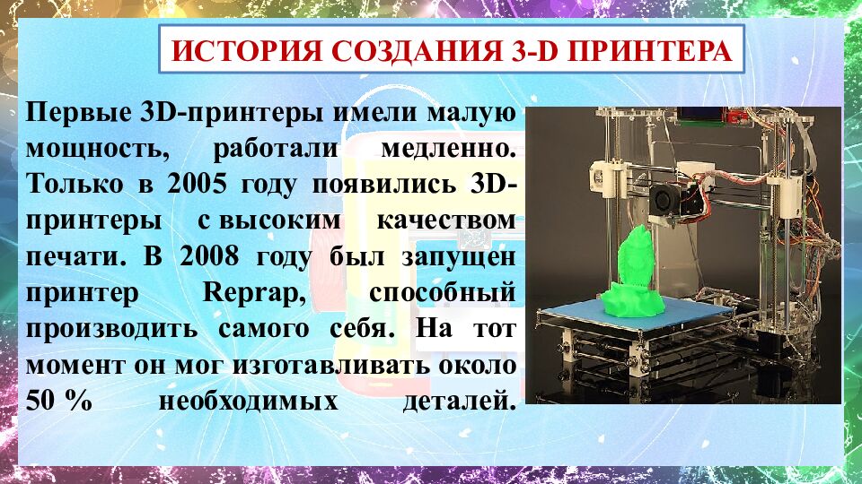 Первые 3D-принтеры имели малую мощность, работали медленно. Только в 2005 году появились 3D-принтеры с высоким качеством печати. В 2008 году был запущен принтер Reprap, способный производить самого себя. На тот момент он мог изготавливать около 50 % необходимых деталей. ИСТОРИЯ СОЗДАНИЯ 3- D ПРИНТЕРА