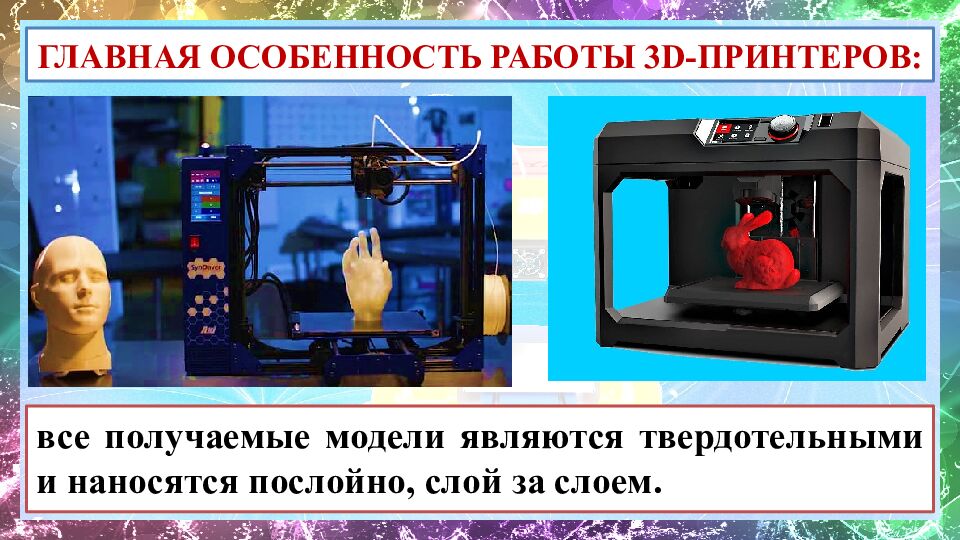 все получаемые модели являются твердотельными и наносятся послойно, слой за слоем. ГЛАВНАЯ ОСОБЕННОСТЬ РАБОТЫ 3 D- ПРИНТЕРОВ: