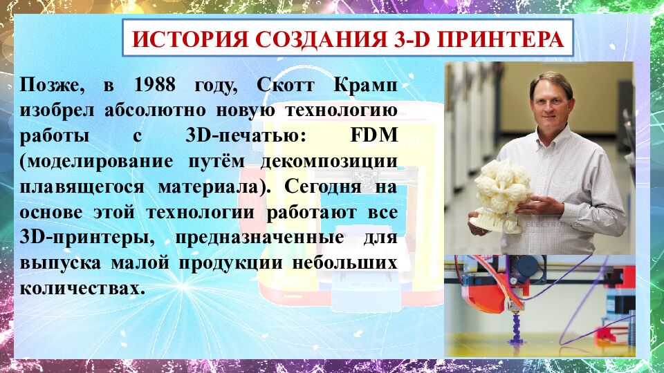 Позже, в 1988 году, Скотт Крамп изобрел абсолютно новую технологию работы с 3D-печатью: FDM (моделирование путём декомпозиции плавящегося материала). Сегодня на основе этой технологии работают все 3D-принтеры, предназначенные для выпуска малой продукции небольших количествах. ИСТОРИЯ СОЗДАНИЯ 3- D ПРИНТЕРА