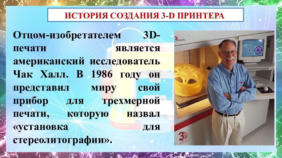 Отцом-изобретателем 3D-печати является американский исследователь Чак Халл. В 1986 году он представил миру свой прибор для трехмерной печати, которую назвал «установка для стереолитографии».