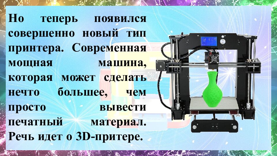 Но теперь появился совершенно новый тип принтера. Современная мощная машина, которая может сделать нечто большее, чем просто вывести печатный материал. Речь идет о 3D-притере.