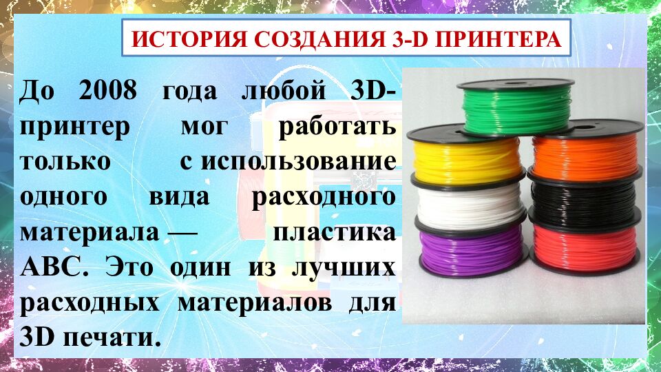 До 2008 года любой 3D-принтер мог работать только с использование одного вида расходного материала — пластика АВС. Это один из лучших расходных материалов для 3D печати. ИСТОРИЯ СОЗДАНИЯ 3- D ПРИНТЕРА