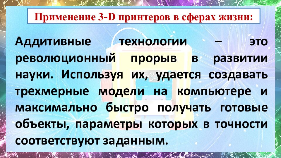 Аддитивные технологии – это революционный прорыв в развитии науки. Используя их, удается создавать трехмерные модели на компьютере и максимально быстро получать готовые объекты, параметры которых в точности соответствуют заданным.